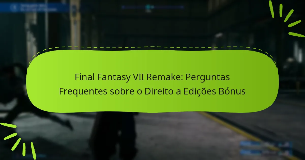 Final Fantasy VII Remake na PlayStation oferece uma variedade de direitos e bónus que melhoram a experiência de jogo com base na edição adquirida. Os jogadores podem aceder a itens adicionais, funcionalidades e melhorias, incluindo conteúdo descarregável exclusivo e itens dentro do jogo. A elegibilidade para estes bónus inclui normalmente compras standard, pré-encomendas e posse de títulos relacionados, cada um com critérios específicos para qualificação.
